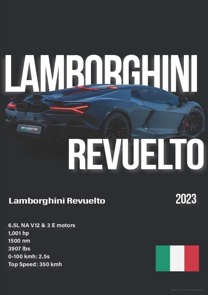 The Revuelto is Lamborghini’s first V12 hybrid — over 1,000 HP, 0–100 km/h in 2.5s.